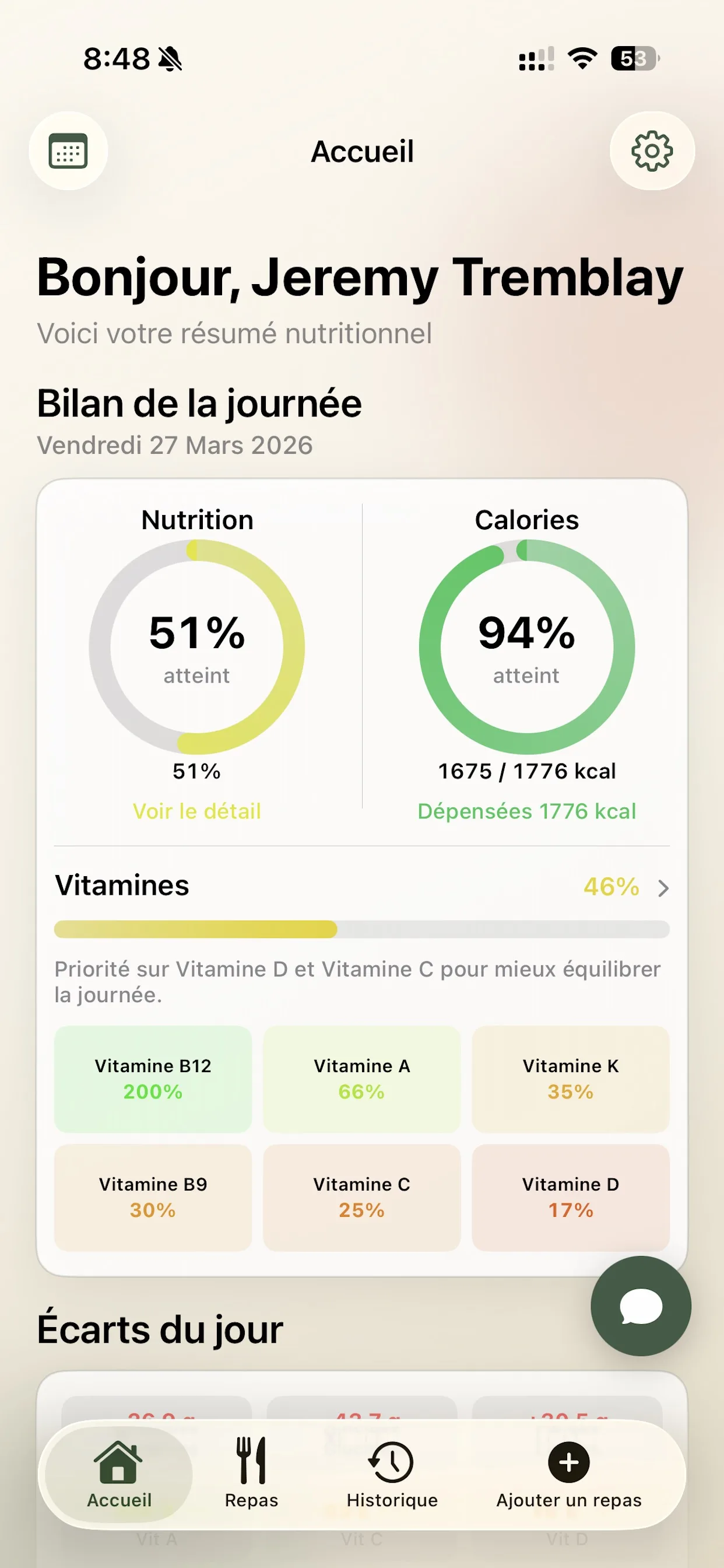 Vue du jour avec anneaux nutrition, vitamines couvertes, écarts du jour et résumé visuel immédiatement lisible.