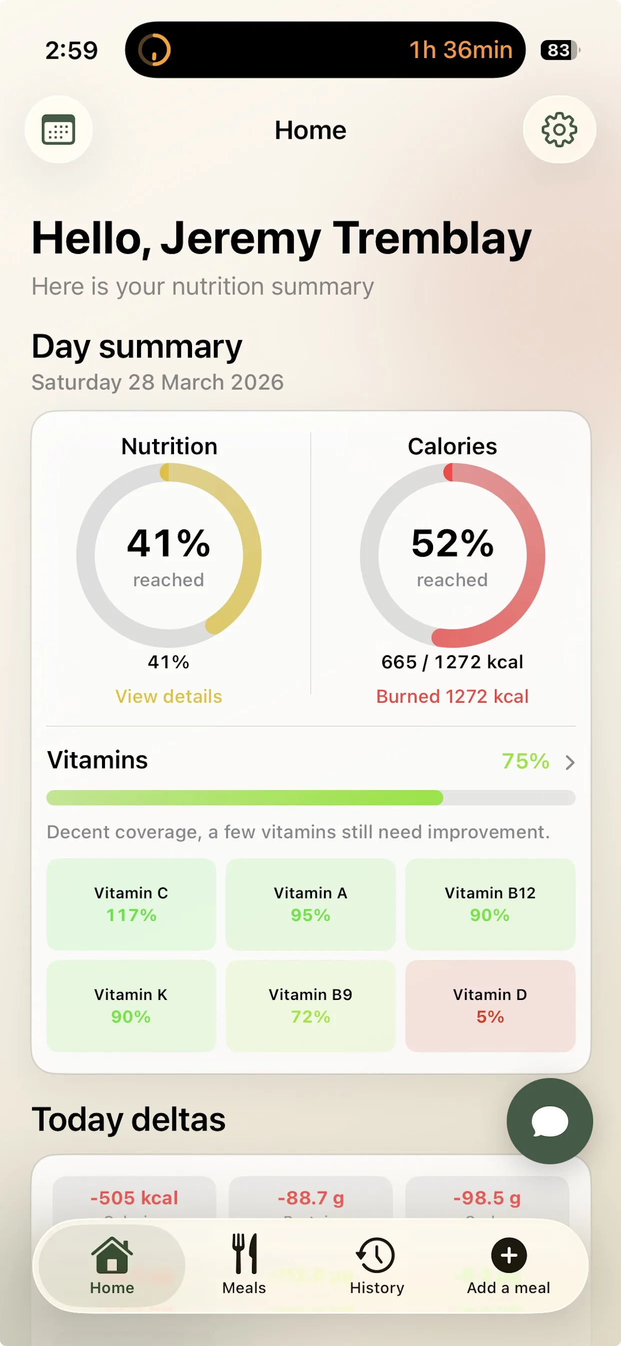 Calories eaten, calories burned, vitamins, daily gaps, and progress cues in one view.
